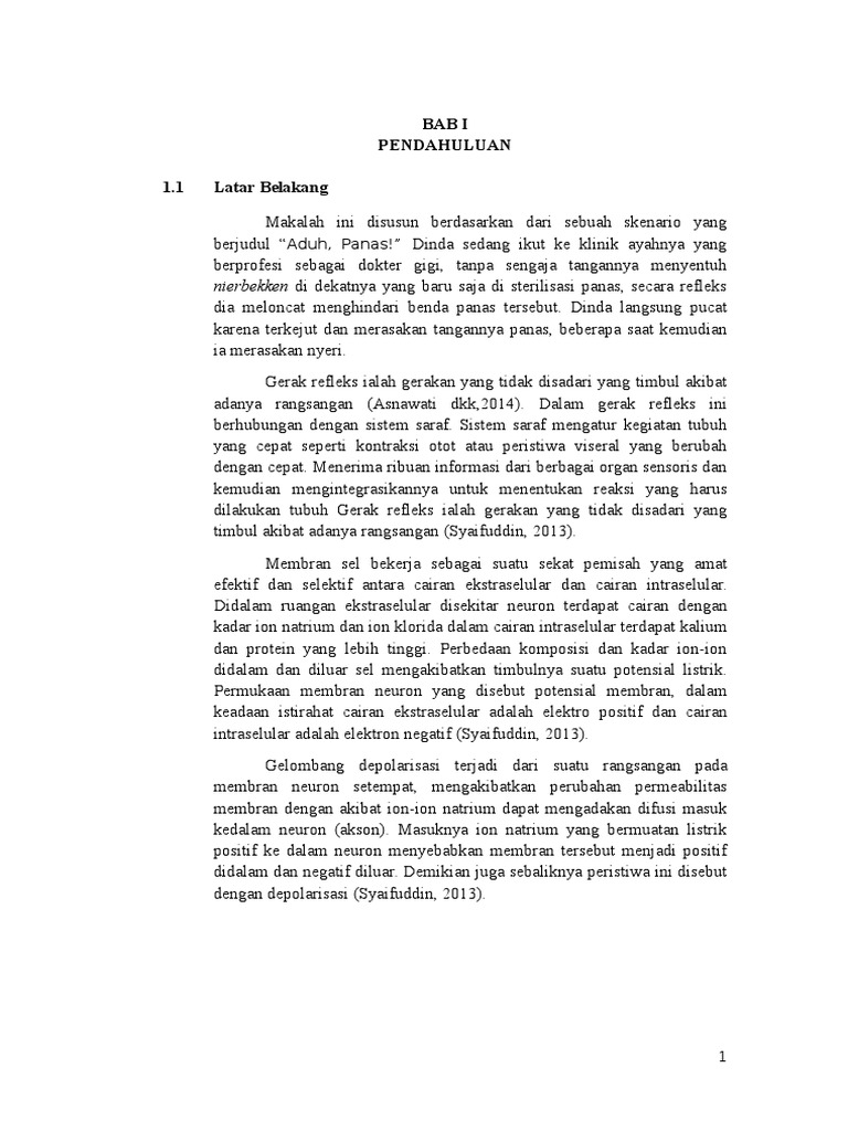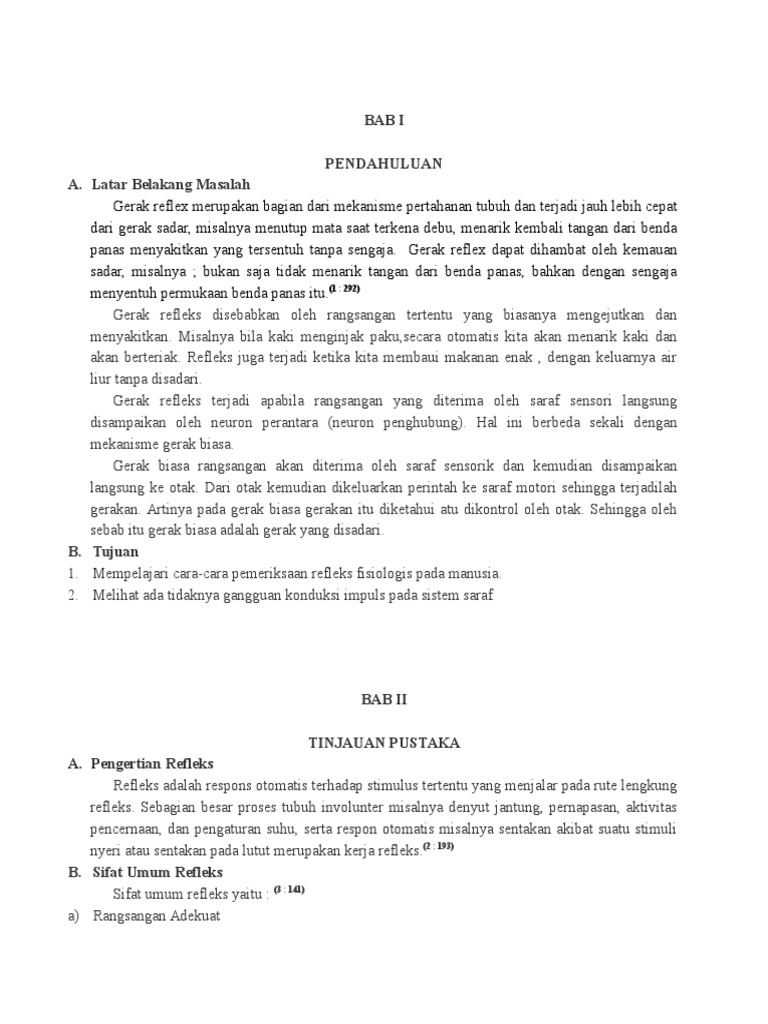 Lengkung refleks proses yang terjadi pada refleks melalui jalan tertentu di sebut lengkung refleks. Bab i pendahuluan latarbelakang jalan pintas ini disebut lengkung refleks. Pada reseptor, saraf aferen, pusat saraf, saraf eferen, efektor lima. Lengkung refleks ini terdiri atas alat indra, neuron aferen, satu sinaps atau lebih yang umumnya terdapat di pusat integrasi sentral, neuron eferen, dan efektor. Semua lengkung (jalur refleks) terdiri dari