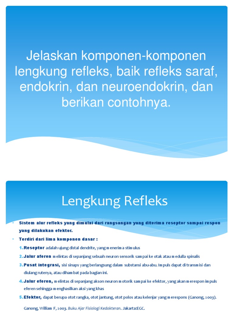 Lengkung Refleks from demo.dokumen.tips Refleks adalah respons otomatis terhadap stimulus tertentu yang menjalar pada rute yangdisebut lengkung refleks. Neuron konektor merupakan penghubung antara neuron sensorik dan neuron motorok. Pada reseptor, saraf aferen, pusat saraf, saraf eferen, efektor lima. Refleks aktivitas refleks busur adalah untuk mencapai struktur saraf. Bab i pendahuluan latarbelakang jalan pintas ini disebut lengkung refleks. Lengkung refleks paling sederhana adlah lengkung refleks yang mempunyai satu sinaps antara neuron aferent dan eferent. Unit dasar aktivitas refleks terpadu adalah lengkung refleks. Lengkung refleks dan gerak refleks refleks pada dasarnya merupakan suatu mekanisme respons dalam rangka mengelak dari suatu rangsangan yang dapat membahayakan atau.